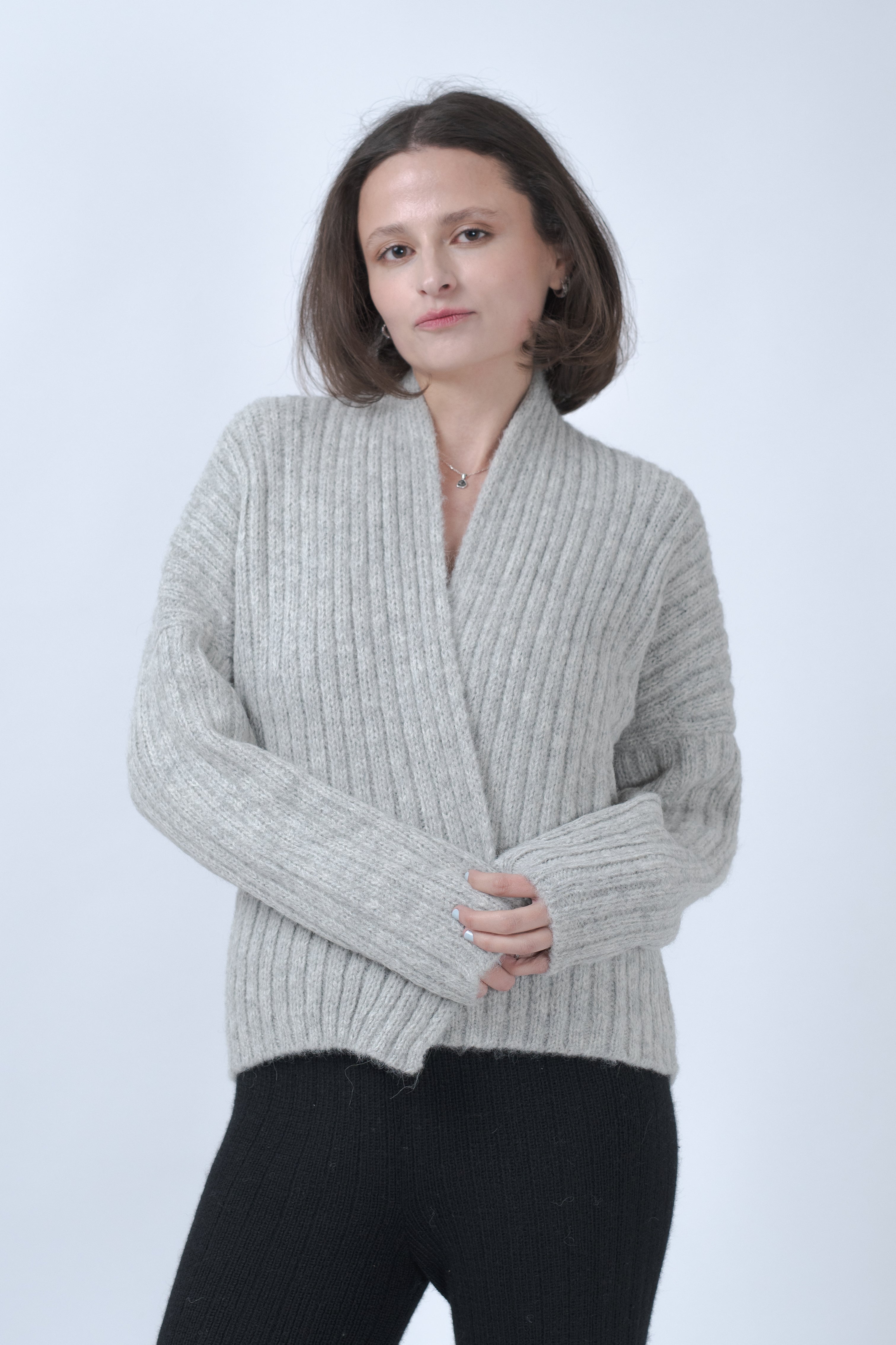 Inspired by the purity and stillness of salt, the Jayu Cardigan embodies quiet strength and refined simplicity. Crafted from soft alpaca wool, its ribbed texture and relaxed silhouette offer warmth, structure, and fluid movement. The wrap-inspired neckline creates a subtle drape — timeless, effortless, and grounding.
