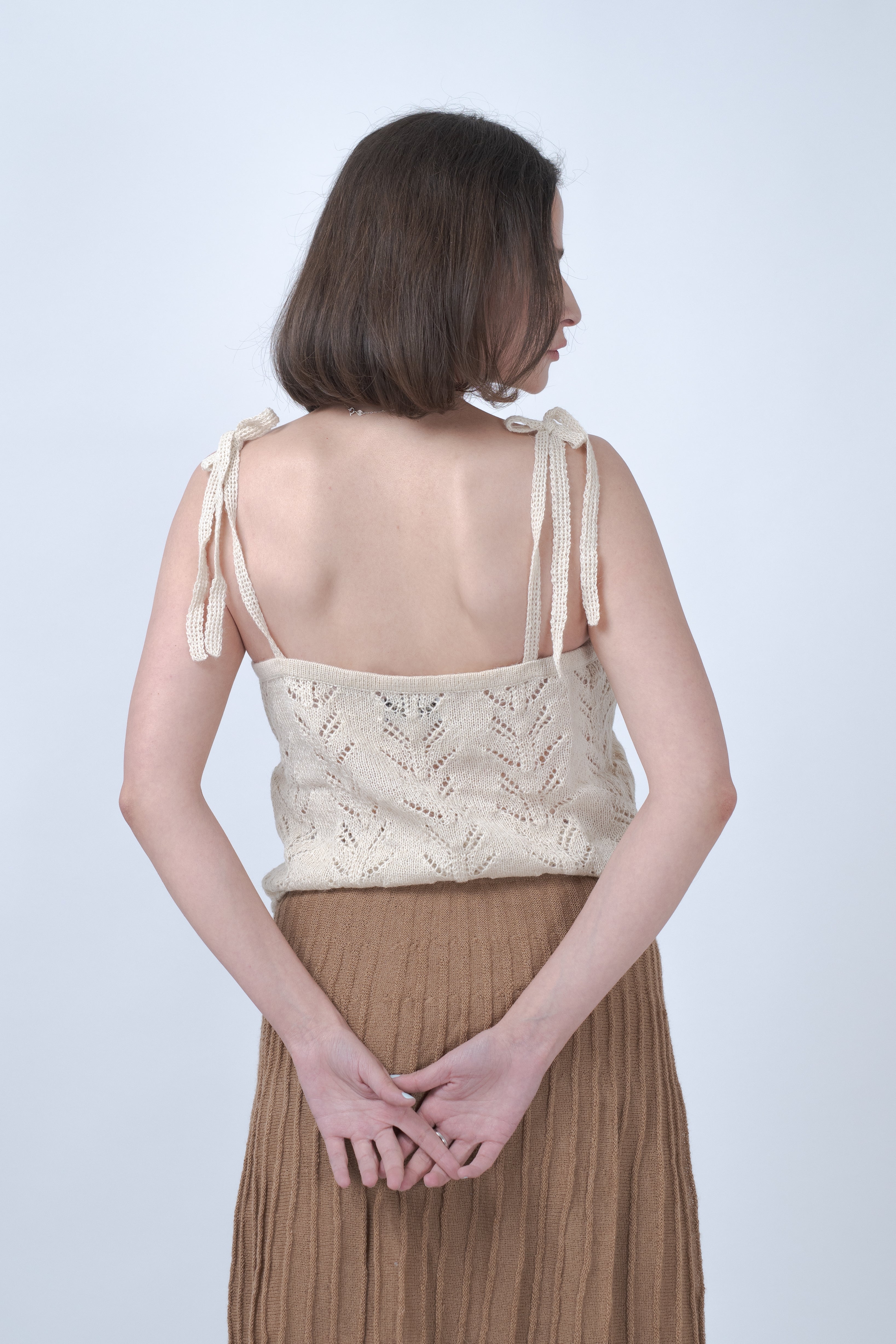 Delicate yet confident, the Yana Top is hand-knitted in soft alpaca with an airy openwork pattern that evokes light and movement. Its fine straps, front buttons, and scalloped edge add a subtle touch of craftsmanship. Designed to layer effortlessly or wear on its own, it brings a quiet sensuality to everyday simplicity.